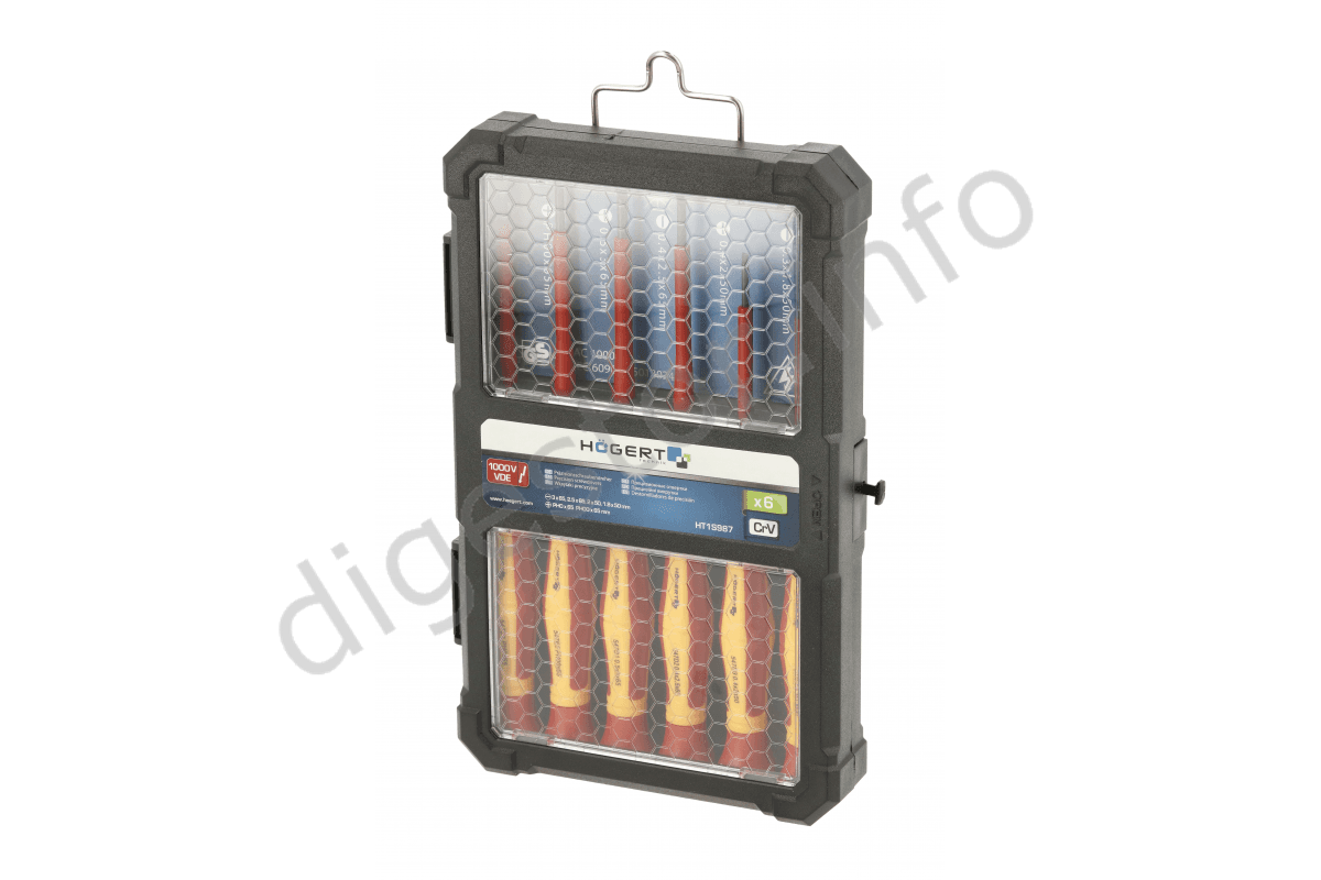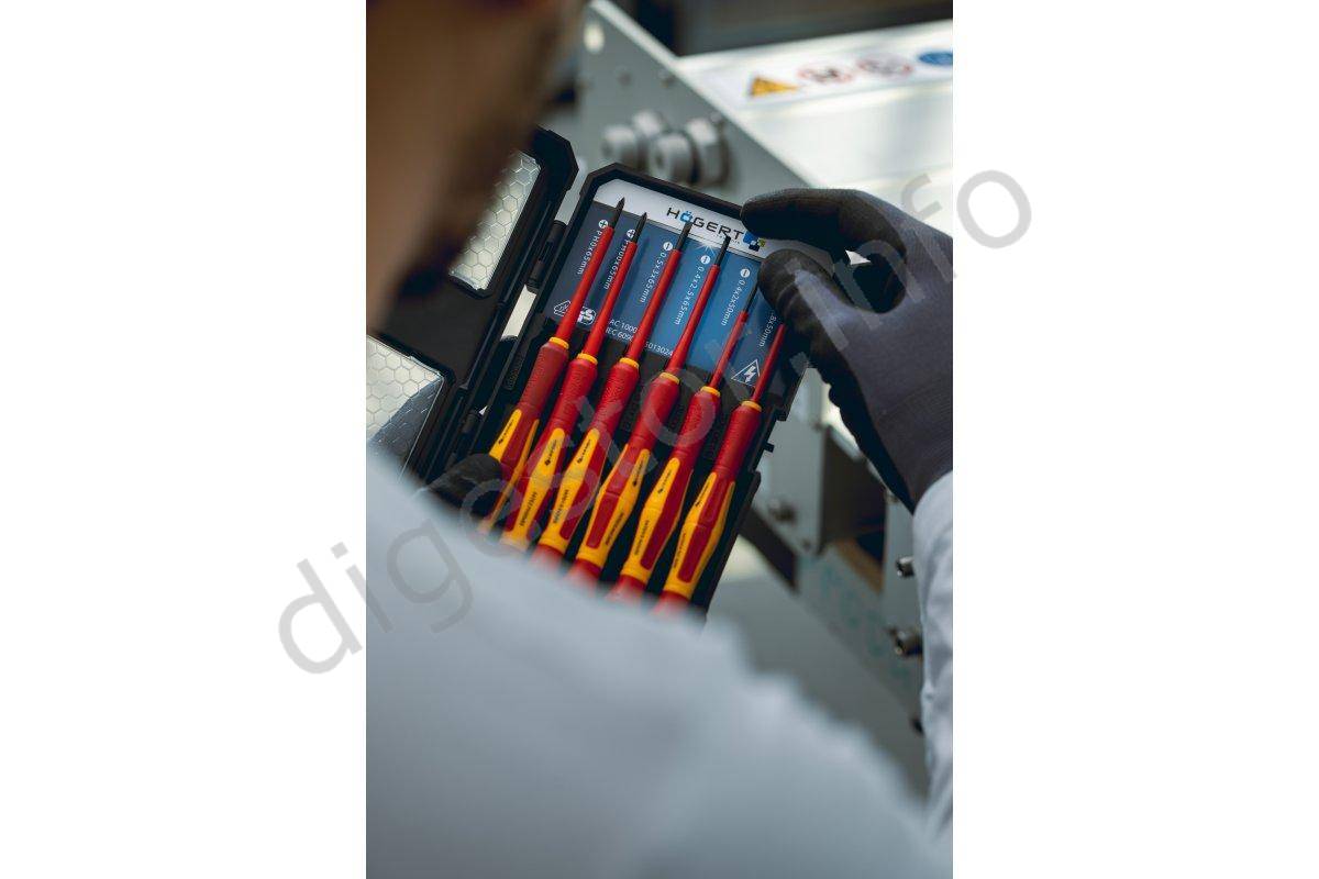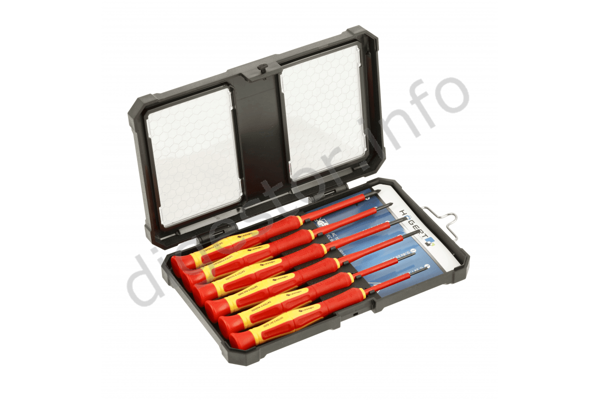 Precision screwdrivers Product description The set includes insulated screwdrivers for working on electrical installations with voltages up to 1,000 volts. The magnetic tips of the screwdrivers make work easier and faster, allowing the screws to be held securely. Markings on the handle allow easy identification of the tip. The two-component, contoured handle provides a comfortable grip.. Characteristics . Made from chrome vanadium steel; . handle made of polypropylene and thermoplastic polyurethane; . VDE 1000 V certificate; . set includes: – SL screwdrivers: 3 x 65 mm, 2.5 x 65 mm, 2 x 65 mm, 1.8 x 65 mm – PH screwdrivers: PH0 x 65 mm, PH00 x 65 mm. Made in Germany ***Ste Firma, Inštitúcia, alebo Obchodník? Dajte si nastavi? Vaše ceny!*** Tel.: +421-903/430803, elmat@elmat.sk