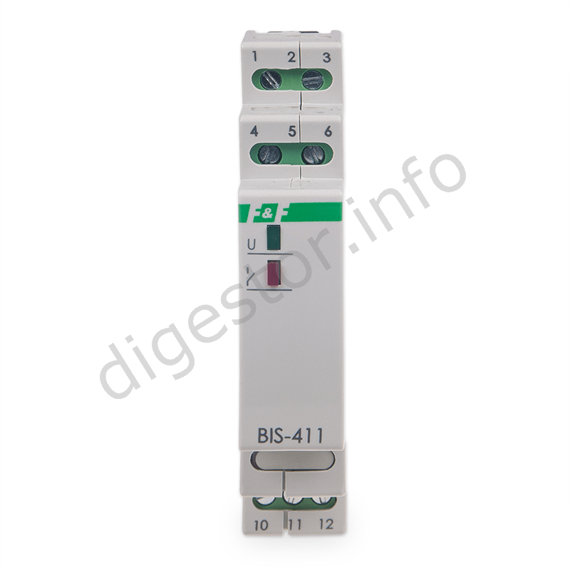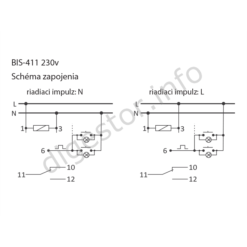 Impulzné relé zapni - vypni 230VAC 16A, BIS-411/230, 1609001 žiarovky do 2000W halogénové žiarovky do 1250W výbojky do 1000W úsporné žiarivky do 500W LED do 250W Ceny pre investičné projekty sa stanovujú na základe množstva a môžu byť výrazne odlišné. Prices for the investment projects are determined on the base of the business case volume and might be significantly different. Elektronické impulzné relé umožňujú ovládanie osvetlenia alebo iného elektronického zariadenia z rôznych miest pomocou paralelne zapojených ovládacích tlačidiel. Elektronické impulzné relé sa odlišujú od magnetických tichým spínaním. Zapnutie osvetlenia alebo iného elektronického zariadenia nasleduje po prúdovom impulze vyvolaným krátkym stlačením ľubovoľného tlačidla zapojeného do relé. Po opätovnom stlačení ľubovoľného tlačidla dôjde k jeho vypnutiu. Relé si "nepamätá" pozíciu kontaktov. Po výpadku napájacieho napätia ostáva kontakt relé vždy vo vypnutej polohe. Zabráni sa tým samočinnému zapnutiu osvetlenia alebo iného elektronického zariadenia bez dozoru pri dlhodobom výpadku napájacieho napätia. Impulzné relé BIS-411 je kompatibilné s tlačidlom vybaveným tlejivkami. Prevedenie: zapni - vypni Napájanie: 165 až 265 V AC Max. prúdové zaťaženie: 16 A Kontakty: 1 × prepínací (NO/NC) Oddelenie kontaktov: áno Príkon: 0,7 W Oneskorenie zapnutia: 0,1 až 0,2 s Prúd ovládacieho impulzu: < 5 mA Podpora tlačidiel s tlejivkami: áno Prevádzková teplota: -25 až 50 °C Rozmer: 1 modul (18 mm) Montáž: na DIN lištu Pripojenie: skrutkové svorky 2,5 mm2 Krytie: IP 20 Installation and connection can be performed only by a qualified electrician. ***Are you a company, institution or trader? Let us to set up Your prices!*** Tel.: +421-903/430803, elmat@elmat.sk Inštaláciu a zapojenie môže vykonávať len kvalifikovaný elektrotechnik. ***Ste Firma, Inštitúcia, alebo Obchodník? Dajte si nastaviť Vaše ceny!*** - +421-903/430803, elmat@elmat.sk
