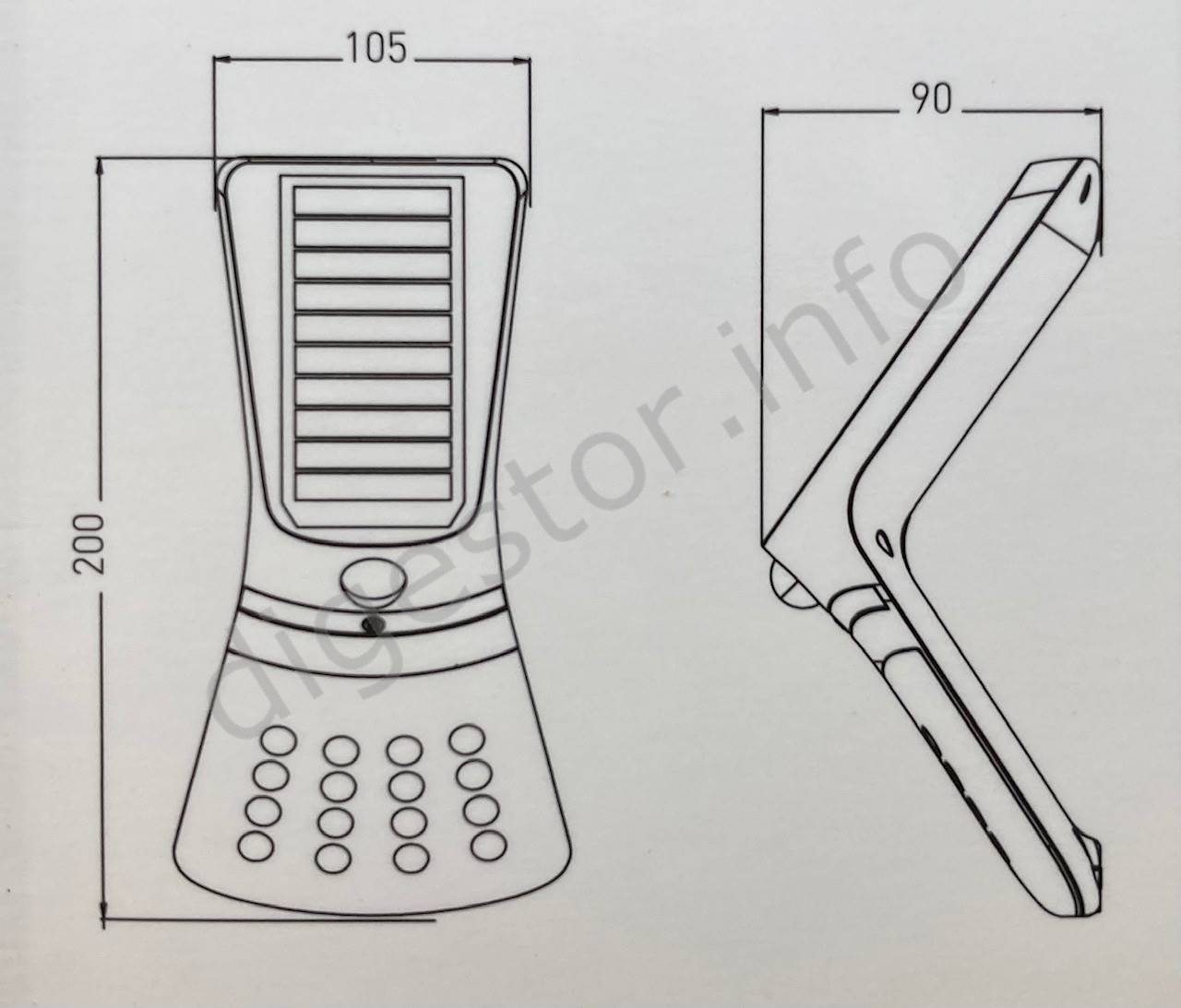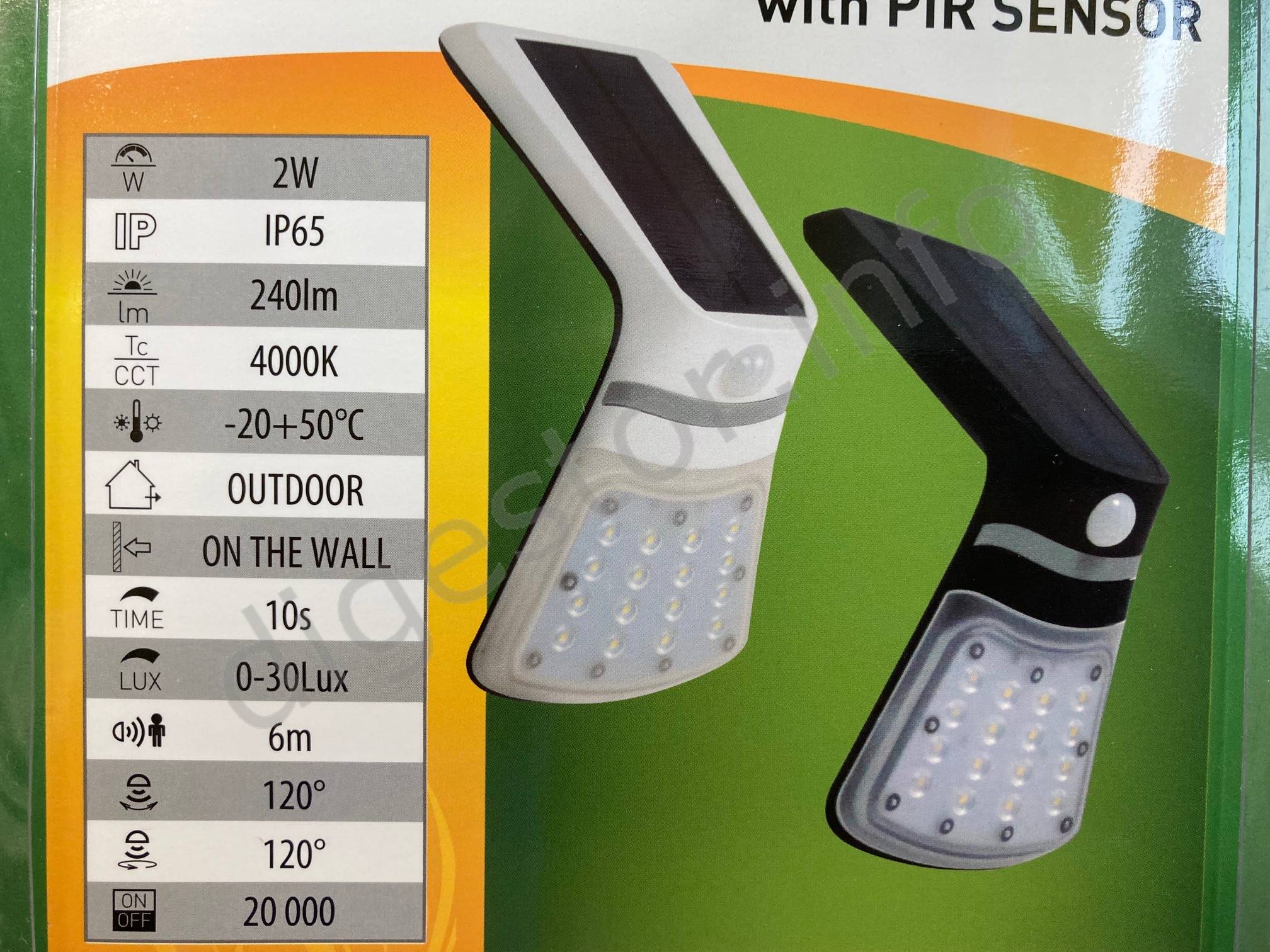 LED svietidlo FOX SOLAR PIR 16LED 2W NW Biele 48/240lm 6m 10s IP65, GXSO006 Ceny stanovujeme podľa množstva Výrazne vyšší svetelný tok. Oproti svojej, z pohľadu laikov "príslušnej" kategórii, je svietivosťou o triedu napred. Prisadené nástenné svietidlo napájané solárnou energiou. Po zotmení v prípade detekcie pohybu v snímanom úseku poskytne plné osvetlenie podľa nastaveného módu. Zadné osvetlenie zaistí decentné osvetlenie steny. Je použitá batéria Li-on 1200mAh 3.7V Odporúčame prečítať návod - kvôli voľbe módu a voľbe výšky montáže (ovplyvňuje dosah pohybového senzora). Montážna šablona aj návod sú medzi kartónovými obalmi. Rázvor vŕtania je 178mm. Inštalačná výška 2m - dosah ca 3,5m Inštalačná výška 3m - dosah ca 5m Inštalačná výška 4m - dosah ca 7m Svietidlo je z kvalitného a odolného plastu. Pre inštaláciu odporúčame zvoliť dobre preslnenú pozíciu tak, aby bolo zaistené kvalitné nabíjanie lithiovej batériie. Možnost voľby 2 módov: MÓD A - Pri detekcii pohybu svieti predná i zadná strana na 100% výkonu po dobu 10s. Pokiaľ nie je pohyb detekovaný, predná i zadná strana svieti na 20% výkonu. MÓD B - Pri detekcii pohybu svieti predná i zadná strana na 100% výkonu po dobu 10s. Pokiaľ nie je pohyb detekovaný, svieti len zadná strana a to na 20% výkonu. MÓD OFF - Svietidlo je trvale vypnuté. Menovitý výkon[W]: 2 Trieda izolácie: III Stupeň krytia IP: IP65 Svetelný tok[lm]: 48/240 Farba svetla: neutrálna biela Teplota chromatickosti Tc[K]: 4000 Index farebného podania[Ra]: 80 Pracovná teplota: -20+50°C Priemerná životnosť [h]: 20 000 Materiál: Polykarbonát Difúzor: Polykarbonát Vyžarovací uhol[°]: 90 Montáž na bežne zápaľné podklady: ANO Dosah čidla [m]: 6 Min. doba činnosti [s]: 10 Uhol činnosti senzora[°]: 120x120 Certifikačné znaky: CE RoHS: RoHS Popisy, technické špecifikácie a preklady © ELMAT SLOVAKIA s.r.o.