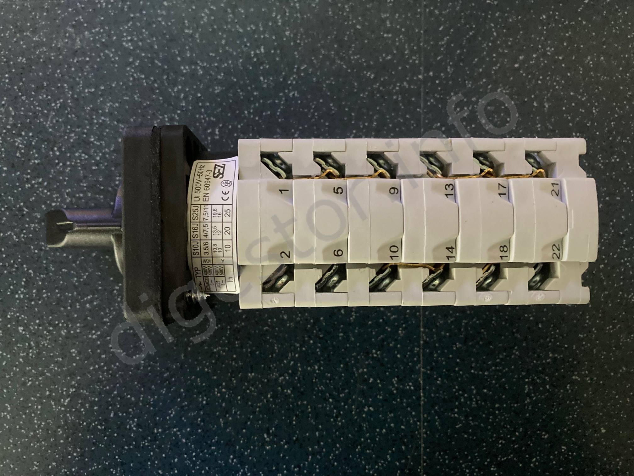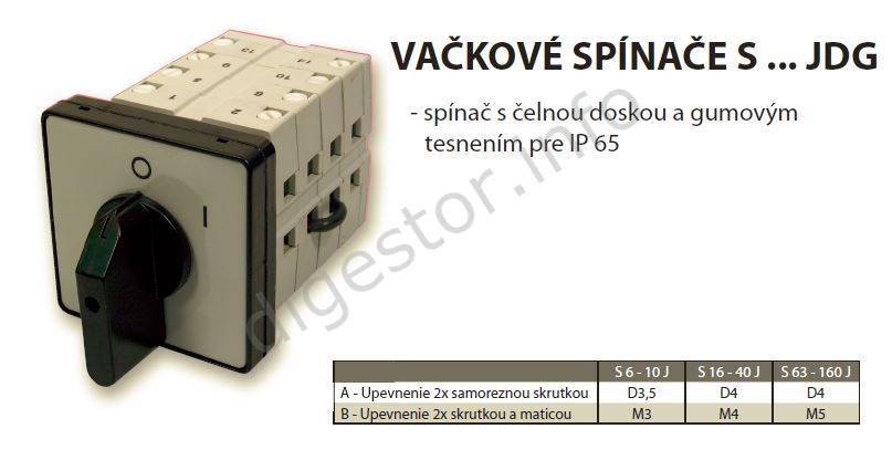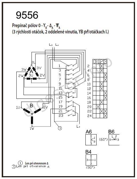 S - spínač 16 - 16A (vyššiu Amperáž môžete použiť aj pre menšie prúdy). J - produktový rad D - spínač s čelnou doskou G - spínač s gumenným tesnením IP65 9556 - číslo schémy zapojenia (3 - pólový, polohy 0-1-2-3) A6 - polohy páčky od 12h vpravo, uhly po 60° 0-1-2-3 - polohy páčky - zvyšovanie otáčok motora Technický popis: Prepinač pólov 0 - YB - DA - YYA (3 rýchlosti otáčok, 2 oddelené vinutia, YB pri otáčkach I.) Installation and connection can be performed only by a qualified electrician. ***Are you a company, institution or trader? Let us to set up Your prices!*** Tel.: +421-903/430803, elmat@elmat.sk Inštaláciu a zapojenie môže vykonávať len kvalifikovaný elektrotechnik. ***Ste Firma, Inštitúcia, alebo Obchodník? Dajte si nastaviť Vaše ceny!*** - +421-903/430803, elmat@elmat.sk