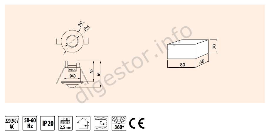 Senzor pohybu CR-5 MINI, VSTAVNÝ Biely (LED), 800W, IP20, 360°, LUX, TIME, max.6m, CR-CR5M00-00