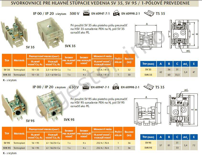 Hlavné vodiče: 1x Cu Al 10-35mm2 Vedľajšie vodiče: 4x Cu 2.5-6/10mm2 (do 10mm2 pevný vodič, lanko len do 6mm2). Pri použití SV 35 ako piateho pólu preznačiť na HSV 35 označenie PEN na N, pól SV35 označiť ako PE. Pre Hlavné Stúpacie Vedenia. IP00 Materiál: Telo - Termoplast Svorkovnice - meď, pocínovaná meď Upevnenie priskrutkovaním, alebo zacvaknutím na DIN lištu TS 35. Na objednávku je možné dodať aj svorkovnice s krytom z transparentného plastu s možnosťou plombovania, s otvormi pre možnosť merania pomocou meracích hrotov a s krytím IP20 po pripojení všetkých vodičov a svoriek. Installation and connection can be performed only by a qualified electrician. ***Are you a company, institution or trader? Let us to set up Your prices!*** Tel.: +421-903/430803, elmat@elmat.sk Inštaláciu a zapojenie môže vykonávať len kvalifikovaný elektrotechnik. ***Ste Firma, Inštitúcia, alebo Obchodník? Dajte si nastaviť Vaše ceny!*** - +421-903/430803, elmat@elmat.sk