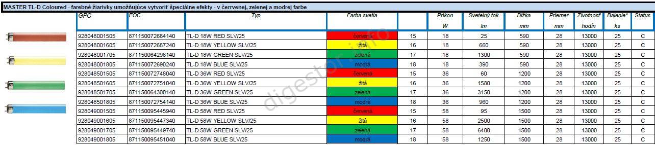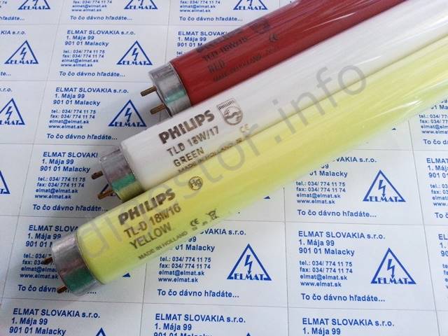 VÝPREDAJ. JEDNOTNÁ CENA PRE VŠETKÝCH. Skladom posledných 7ks. Obrázok je ilustračný. MASTER TL-D Coloured - farebné žiarivky pre vytvorenie špeciálnych efektov. 18W - dĺžka 590mm Staršie značenie: 18W/18 - modrá 18W/17 - zelená 18W/16 - žltá 18W/15 - červená Technické parametre pozrite v obrázkovej galérii v tabuľke. Priemerná životnosť 13.000h Pozn.: Priemerná životnosť svetelného zdroja je priemer životností svetelných zdrojov v danej svetelnej sústave (skupine svietidiel a zdrojov). Uvedením priemernej životnosti sa definuje doba, za ktorú skončí životnosť (zlyhá) 50% svetelných zdrojov danej svetelnej sústavy. ***Are you a Company, Institution or Trader? Let us to set up Your prices!*** Tel.: +421-903/430803, elmat@elmat.sk ***Ste Firma, Inštitúcia, alebo Obchodník? Dajte si nastaviť Vaše ceny!*** Tel.: +421-903/430803, elmat@elmat.sk